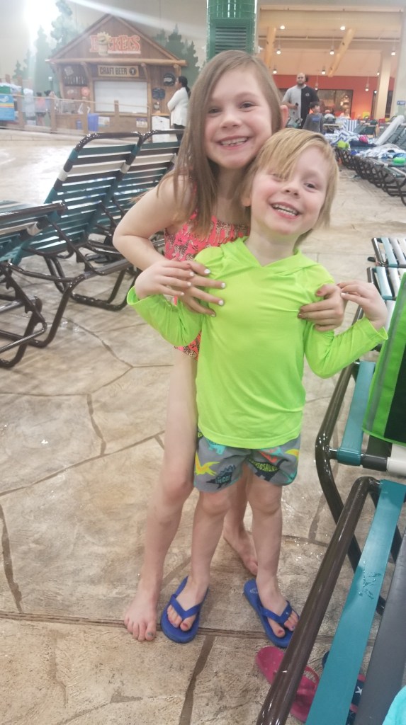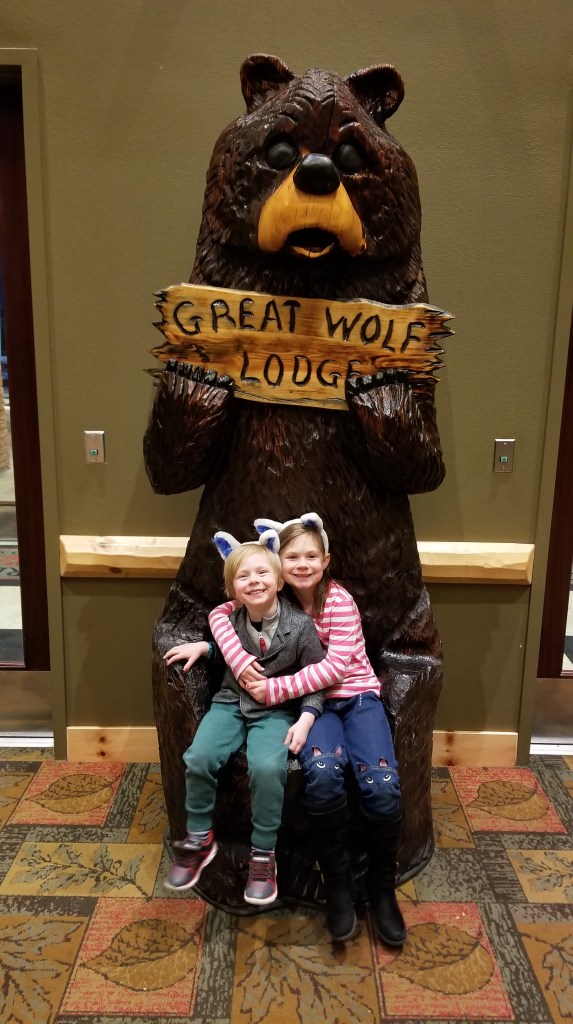 We of course ran to our room and got on our suits. One nice part of GWL is that you can bring in your own drinks and snacks to keep at a table by the pool. We also had snacks in the room. We stayed for 3 nights so having the extra snacks was necessary. The amenities are good but not great for all. We had miniature golf, arcade, mini bowling, Build – A – Bear Workshop, Ben and Jerry’s ice cream, Dunkin’ Donuts (for all the coffee) and their snack bar has some unique cocktails to numb your ears from the deafening screams of excited children. The wave pool was pretty cool and the giant water jungle gym was great for the boy. The big girl was very much into the slides but just barely tall enough to go alone, so a parent was constantly pulled up with her and one of us left to wade in the kiddie pools with little man.