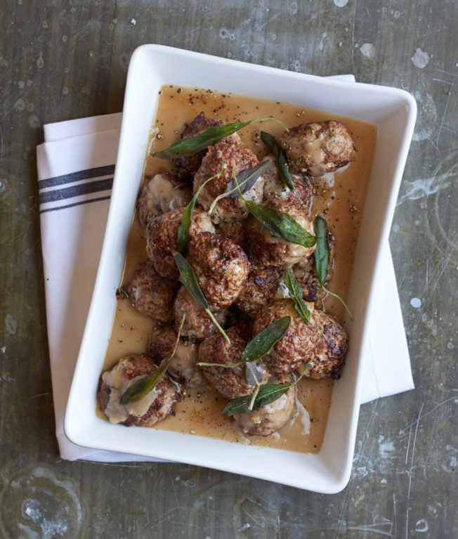 For those who want to do something different this Thanksgiving, Chef Joshua McFadden suggests skipping a whole turkey in favor of these turkey meatballs flavored with fresh sage, rosemary and thyme. When they’re served with Thanksgiving trimmings like mashed potatoes and cranberry sauce, no one will miss the roast turkey at all.